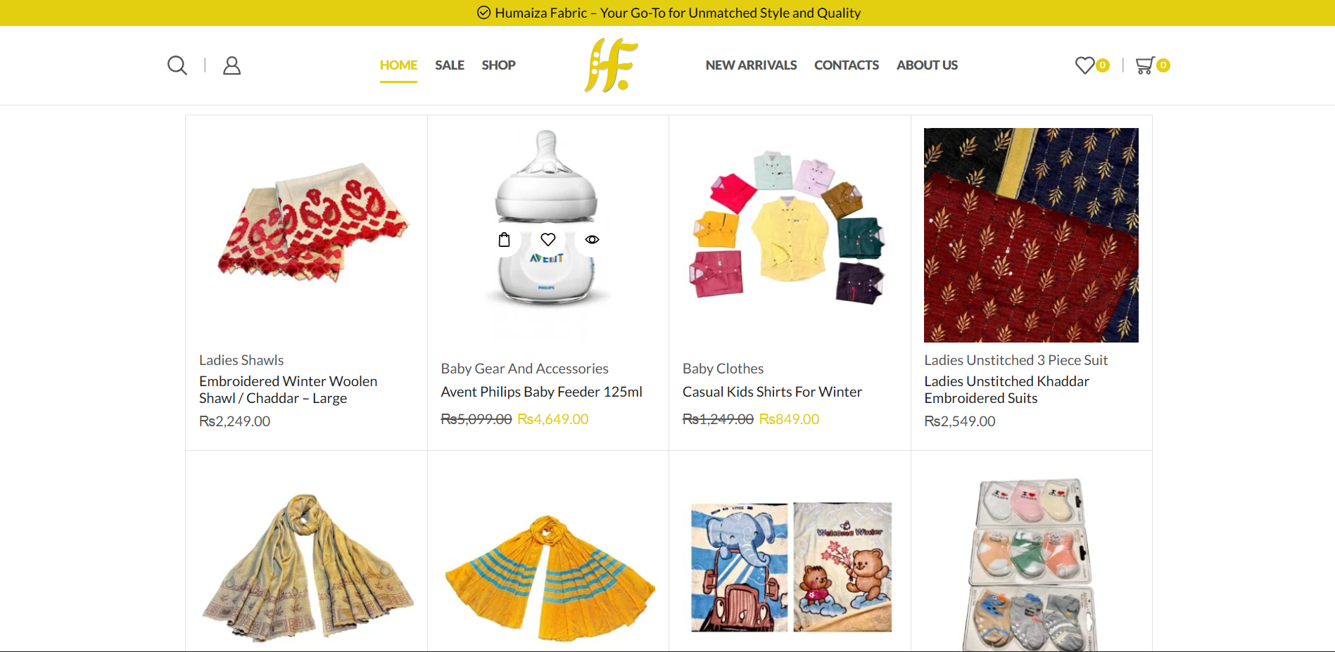 Humaiza Fabric — a responsive eCommerce website built with WordPress & XStore theme, optimized for performance, SEO, and secure online shopping.