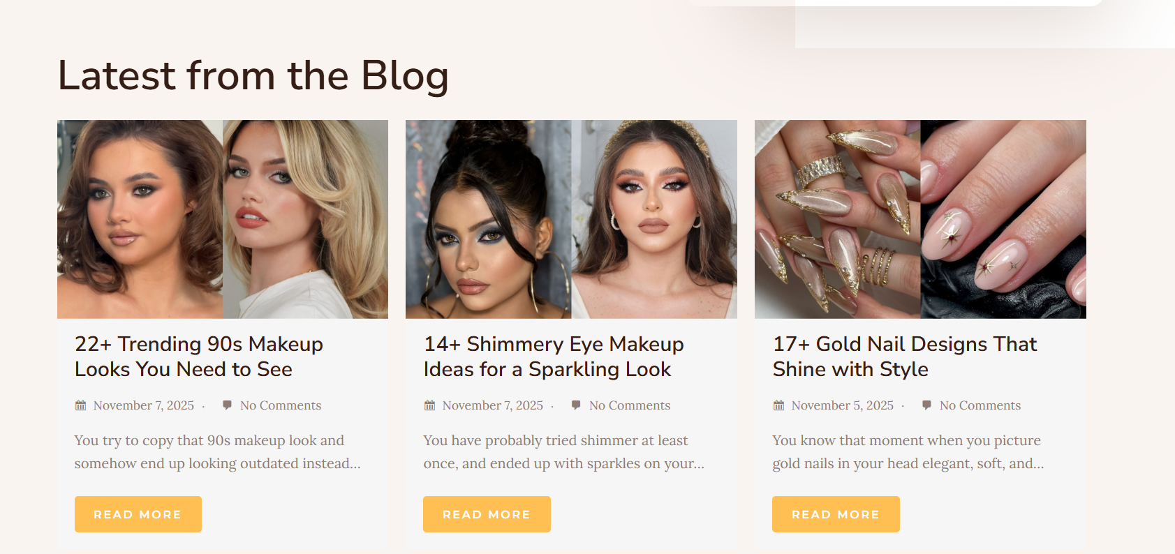 An advanced search and category filter system helps visitors quickly find content such as “Fall Nails 2025,” “Bridal Makeup,” or “Business Casual Outfits.” On mobile, Nesty Craft also supports PWA-style Add to Home Screen behaviour — letting users access it like a dedicated fashion app for quick daily reads.